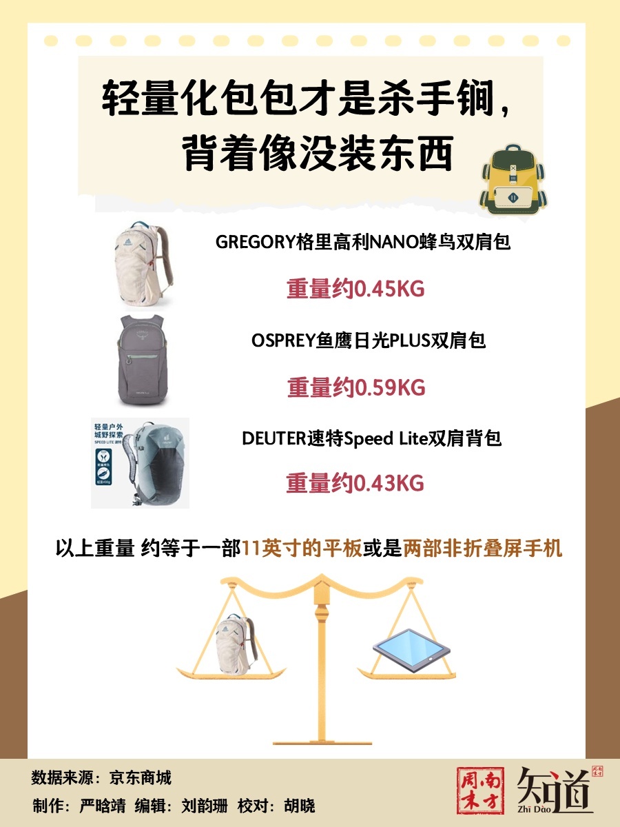 OSPREY鱼鹰等品牌的主流背包,重量仅0.4-0.6千克之间,约等于一部11英寸平板或两部非折叠屏手机,背着就像是没装东西的体验,让每天挤地铁、赶公交的打工人彻底告别负重通勤。