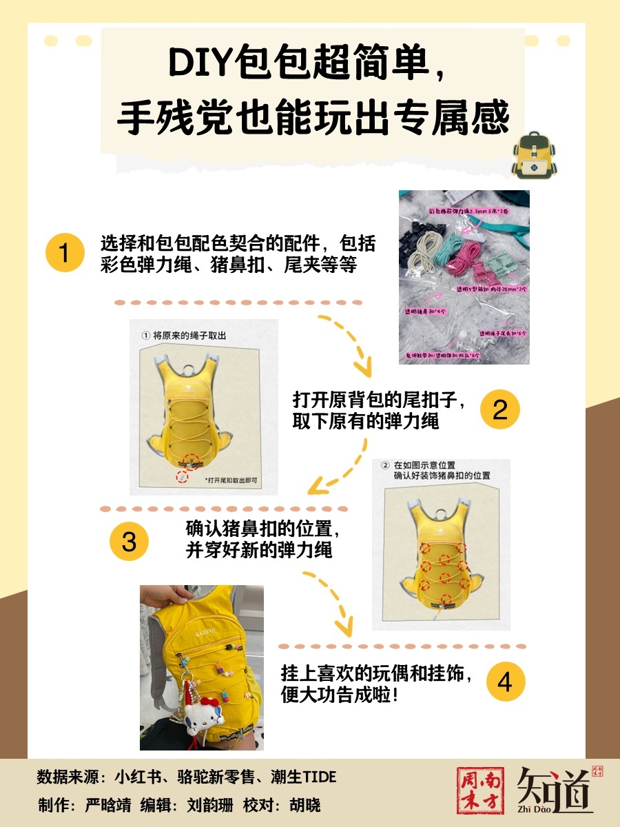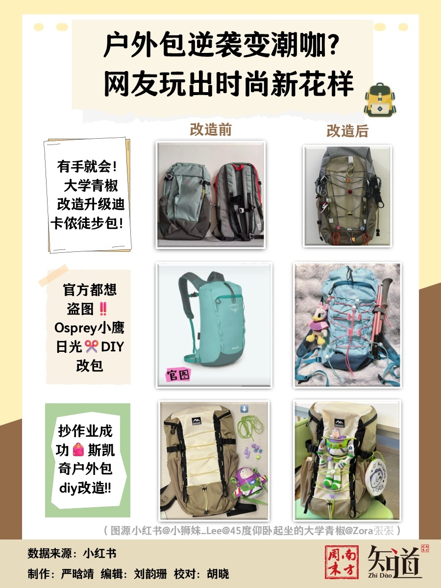 更有趣的是,户外包还能玩出花样,在小红书等社交媒体上,“大学青椒改造迪卡侬徒步包”“Osprey小鹰包DIY外挂系统”等笔记火了,改造步骤简单到有手就行。