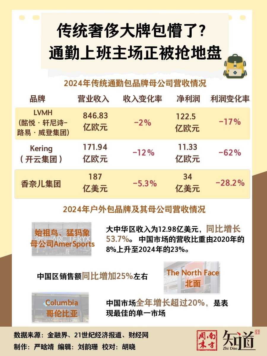 LVMH(酩悦·轩尼诗-路易·威登集团)、开云集团、香奈儿集团的营业收入和净利润都呈现出不同程度的下滑,这些靠着品牌效应吸引职场人的传统通勤包,正在逐渐失去吸引力。